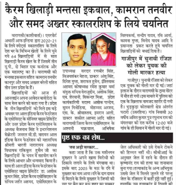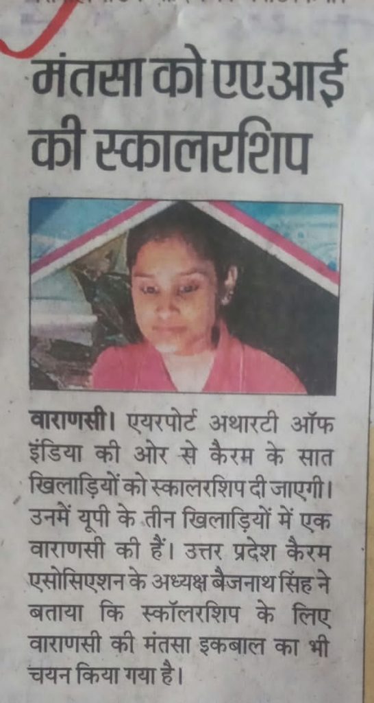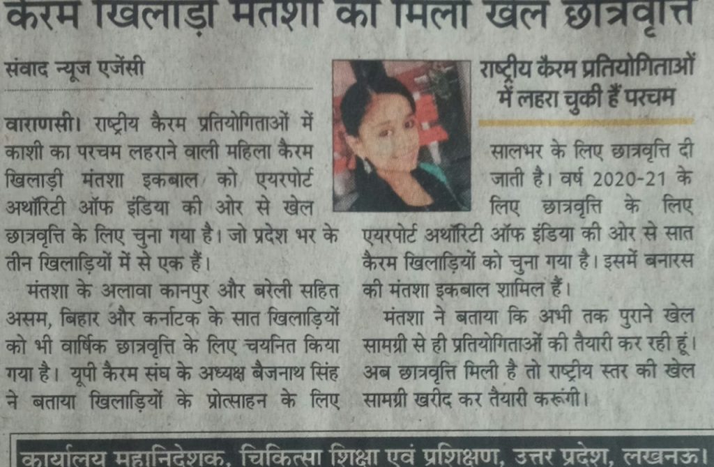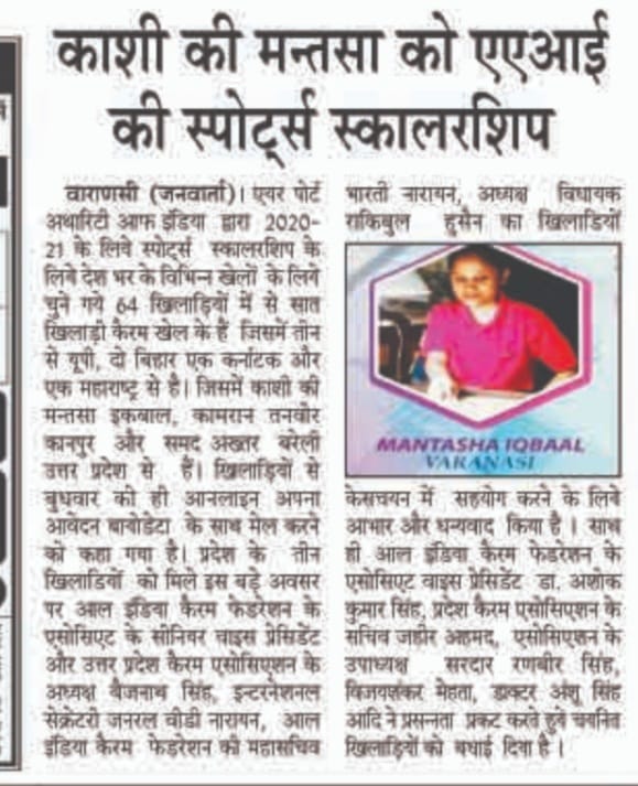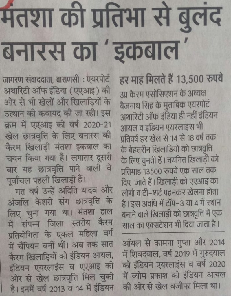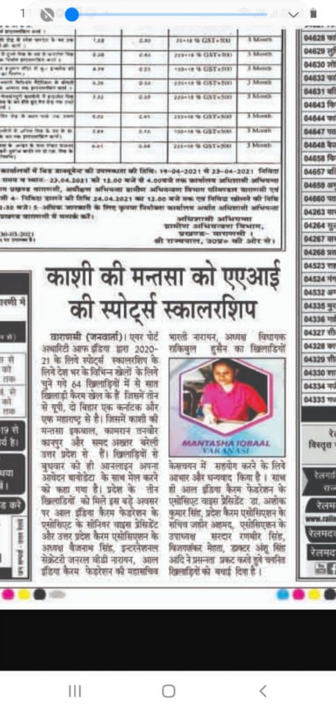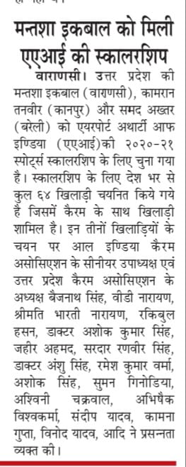 *एअर पोर्ट अथार्टी आफ इन्डिया द्वारा 220= 21 के लिये स्पोर्ट्स स्कालरशिप के लिये चुने गये चार खिलाड़ियों में वाराणसी की मन्तसा इकबाल सहित एक कानपुर और एक बरेली सहित तीन उत्तर प्रदेश के । *