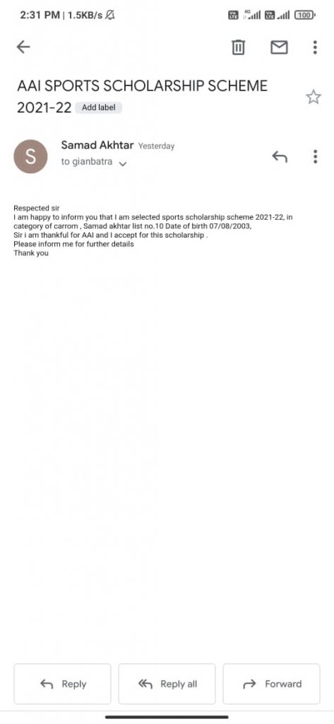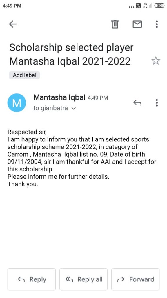 कैरम खिलाड़ी मन्तसा इकबाल , कामरानतनवीर और समद अख्तर A.A.I. स्कालरशिप के लिये चयनीत ।